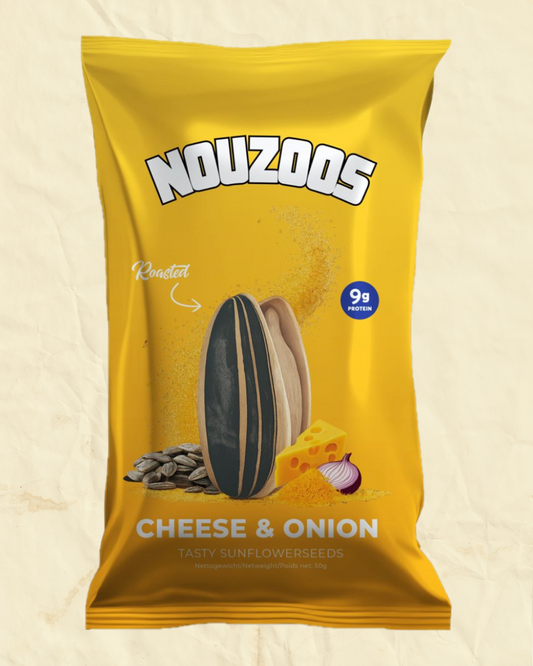De Nouzoos Box bevat 14 to-go zakjes zonnebloempitten met afvalzakje – schoon, handig en lekker voor onderweg.